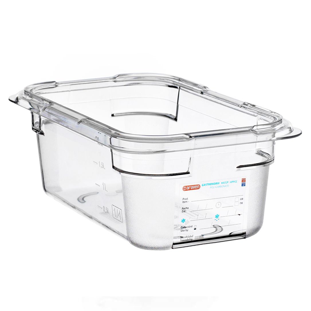 Гастроємність із полікарбонату GN 1/4 від бренду Araven рекомендовано використовувати для викладки та зберігання продуктів у холодильниках. Гастроємності з полікарбонату служать довше порівняно з іншими пластиковими гастроємностями. Матеріал виробу безпечний для контакту з продуктами харчування. Ємність підлягає переробці, завдяки екологічності матеріалу.