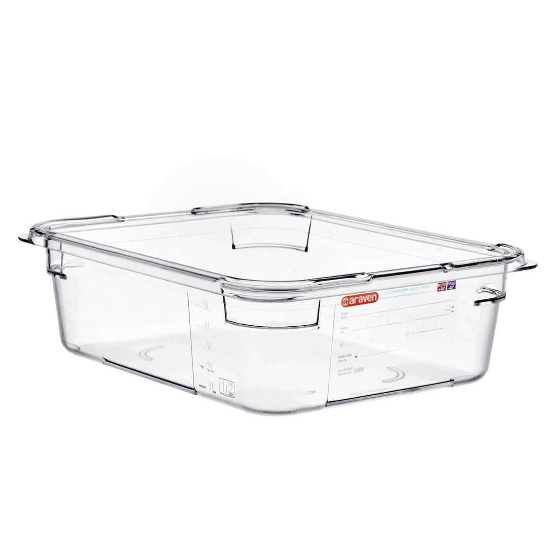 Гастроємність із полікарбонату GN 1/2 від бренду Araven рекомендовано використовувати для викладки та зберігання продуктів у холодильниках. Гастроємності з полікарбонату служать довше порівняно з іншими пластиковими гастроємностями. Матеріал виробу безпечний для контакту з продуктами харчування. Ємність підлягає переробці, завдяки екологічності матеріалу.