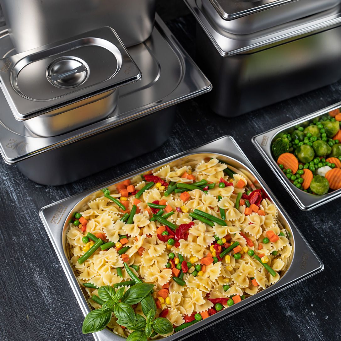 Гастроємність із нержавіючої сталі GN 2/3 серії Bestkeep від бренду FoREST використовують для всіх видів теплового та холодильного обладнання, а також для викладки вітрин.