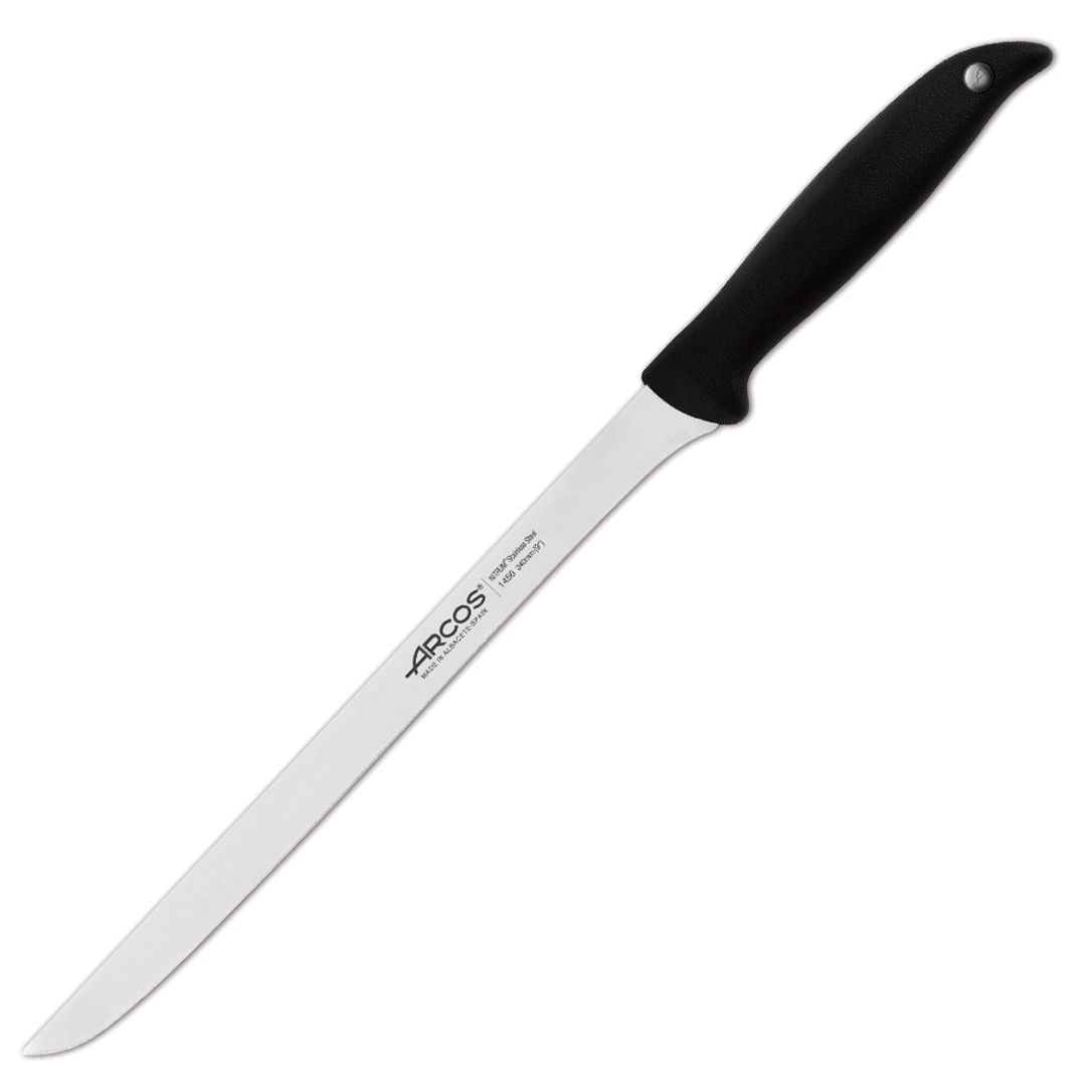 Ніж для хамону 145600 серії Menorca від іспанського бренду Arcos рекомендовано використовувати для для нарізання хамону, прошуто та інших видів сиров’яленого м’яса. Завдяки довгому гнучкому лезу ніж забезпечує рівні, тонкі скибки без розривів структури продукту, зберігаючи його текстуру та смак.
