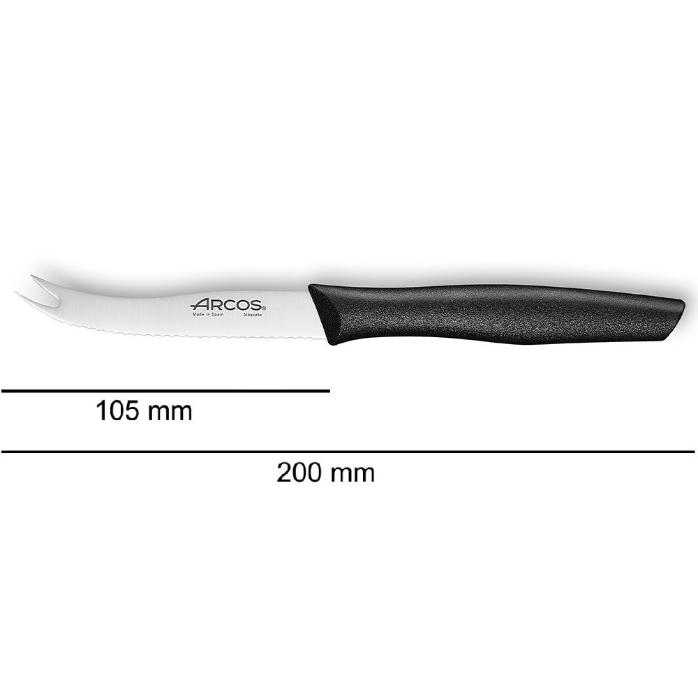 Ніж для сиру 188700 серії Nova від іспанського бренду Arcos призначений для зручного та акуратного нарізання м’яких і напівтвердих сирів. Завдяки вигнутому лезу з хвилястою заточкою та подвійним роздвоєним кінчиком, ніж ідеально підходить не лише для нарізання, а й для сервірування — ви легко можете підчепити та подати шматочки сиру.
