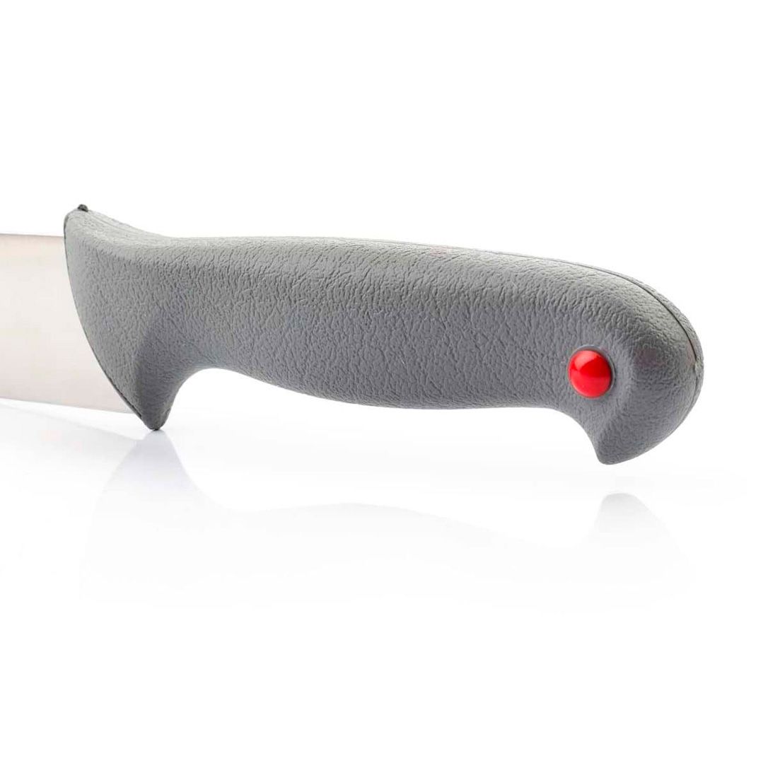 - ергономічна рукоятка з поліпропілену з антиковзким каучуковим покриттям. потовщення посередині зменшує навантаження на кисть руки впродовж тривалої роботи ножем