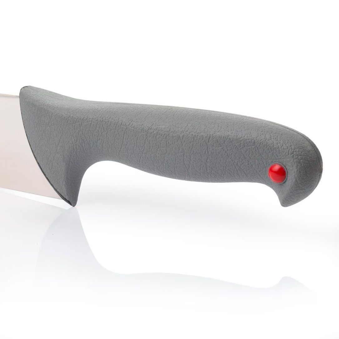 - ергономічна рукоятка з поліпропілену з антиковзким каучуковим покриттям. потовщення посередині зменшує навантаження на кисть руки впродовж тривалої роботи ножем