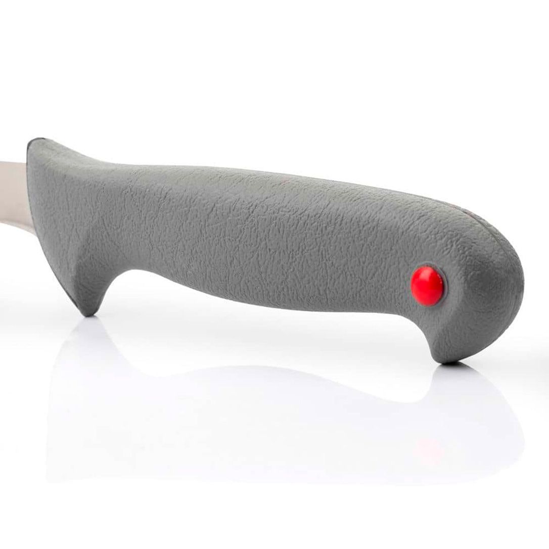 - ергономічна рукоятка з поліпропілену з антиковзким каучуковим покриттям. потовщення посередині зменшує навантаження на кисть руки впродовж тривалої роботи ножем