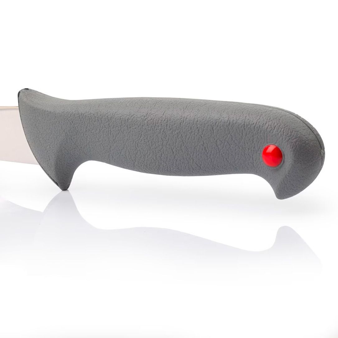 - ергономічна рукоятка з поліпропілену з антиковзким каучуковим покриттям. потовщення посередині зменшує навантаження на кисть руки впродовж тривалої роботи ножем