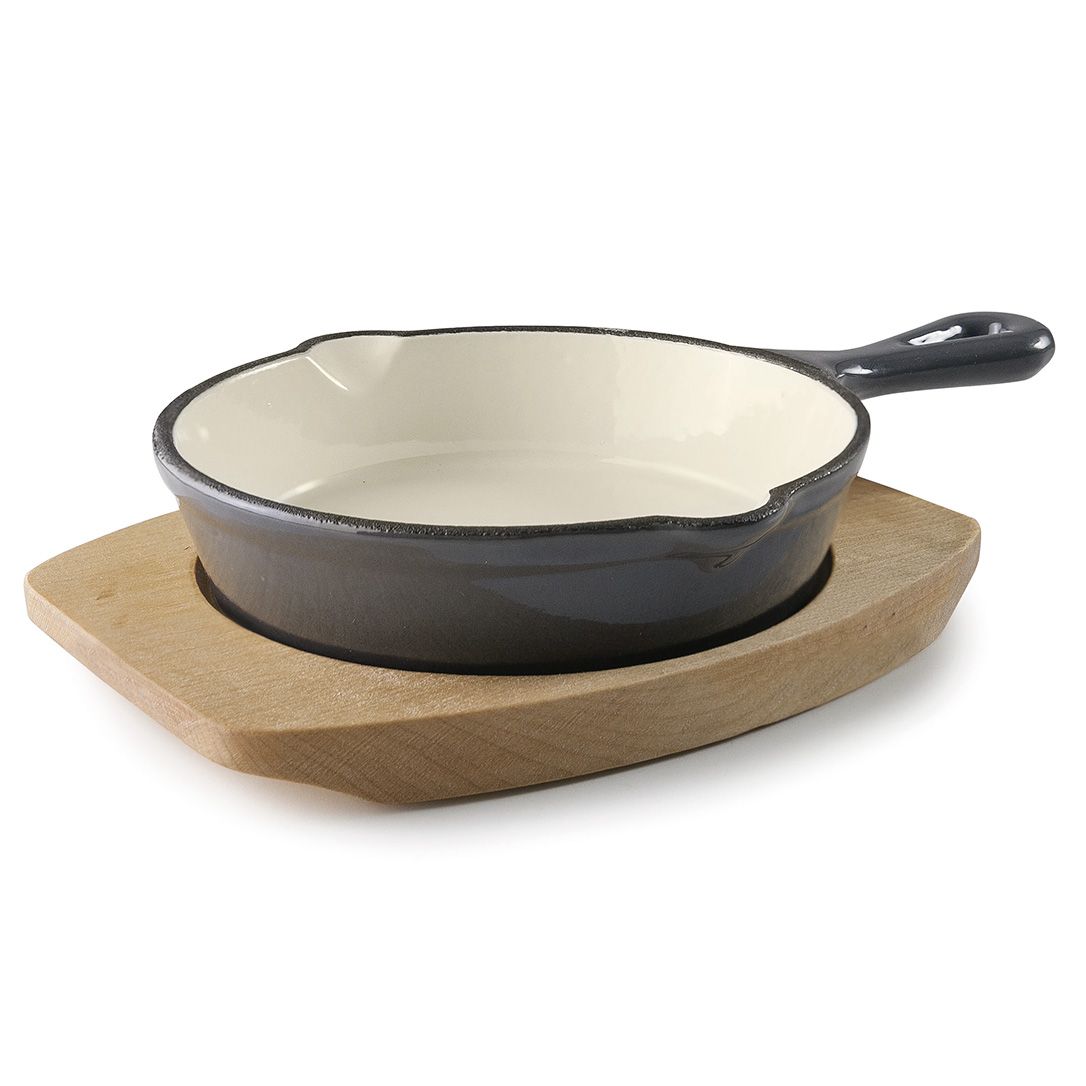25843 Пательня чавунна емальована кругла d-13,5 см на дерев'яній підставці
