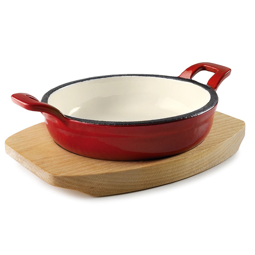 25851 Пательня чавунна емальована з двома ручками d-12 см на дерев'яній підставці