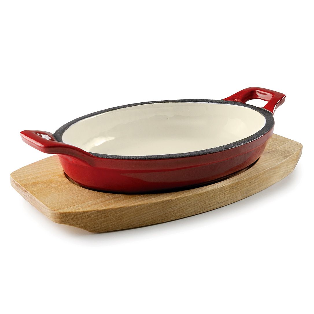 25852 Пательня чавунна емальована з двома ручками17,5х12,5х3 см на дерев'яній підставці