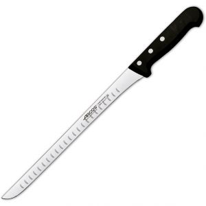 Ніж для хамону 281901 серії Universal від іспанського бренду Arcos рекомендовано використовувати для для нарізання хамону, прошуто та інших видів сиров’яленого м’яса. Завдяки довгому гнучкому лезу ніж забезпечує рівні, тонкі скибки без розривів структури продукту, зберігаючи його текстуру та смак