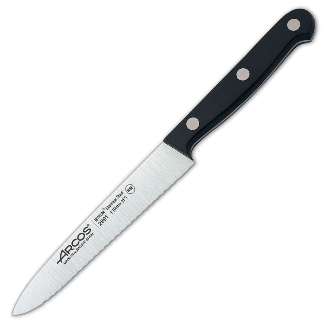 Ніж для томатів 289104 серії Universal від іспанського бренду Arcos рекомендовано використовувати для легкого та акуратного нарізання помідорів, м’яких овочів, фруктів із тонкою шкіркою, а також сиру чи ковбаси. Завдяки спеціальному серейторному лезу ніж з легкістю прорізає шкірку, не пошкоджуючи ніжної м’якоті