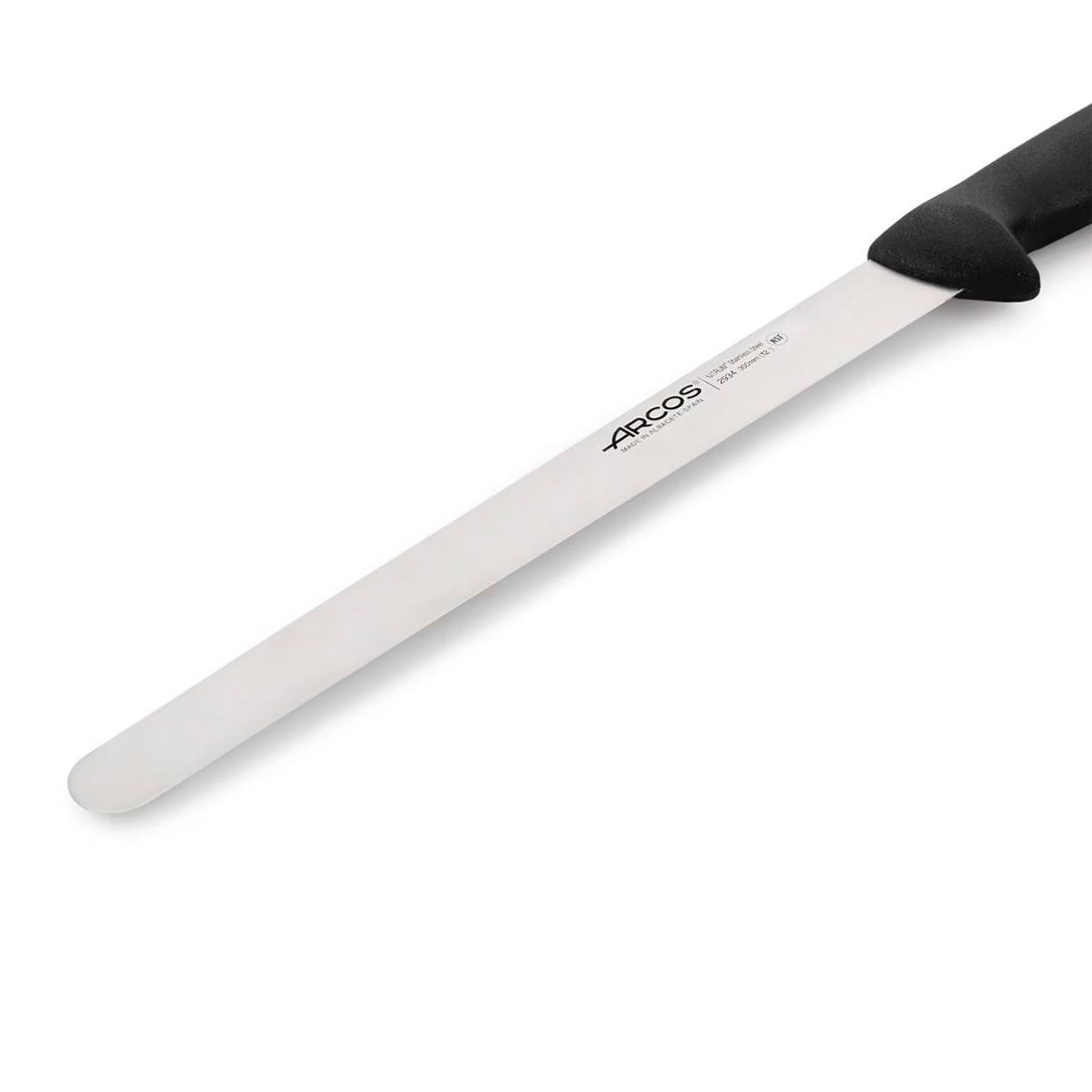 Ніж для хамону 293425 серії 2900 від іспанського бренду Arcos рекомендовано використовувати для для нарізання хамону, прошуто та інших видів сиров’яленого м’яса. Завдяки довгому гнучкому лезу ніж забезпечує рівні, тонкі скибки без розривів структури продукту, зберігаючи його текстуру та смак.