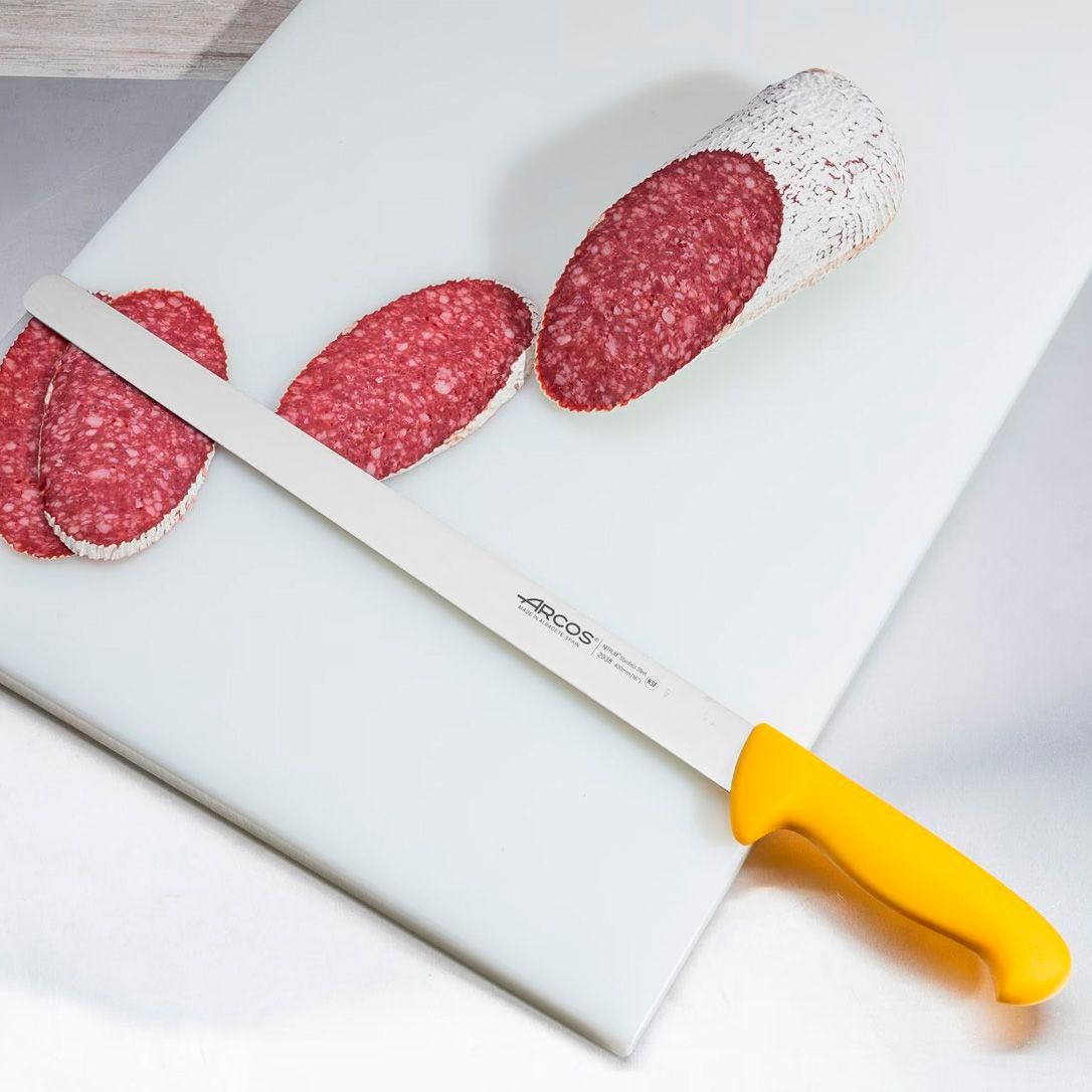 Ніж для хамону 293800 серії 2900 від іспанського бренду Arcos рекомендовано використовувати для для нарізання хамону, прошуто та інших видів сиров’яленого м’яса. Завдяки довгому гнучкому лезу ніж забезпечує рівні, тонкі скибки без розривів структури продукту, зберігаючи його текстуру та смак.