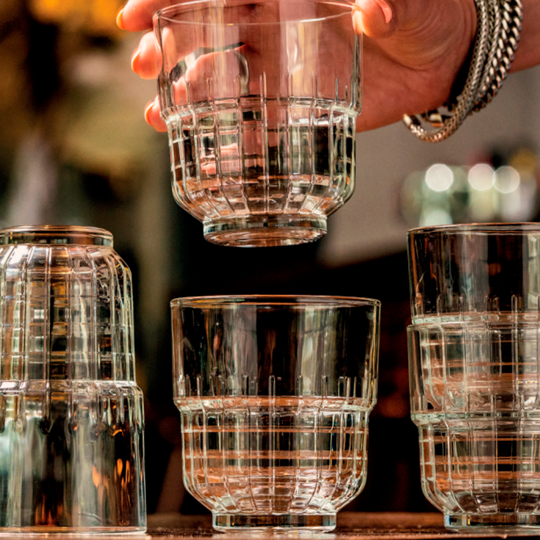 Склянка низька 833942 серії TARQ від бренду ONIS рекомендовано використовувати для подачі міцних алкогольних напоїв, рому, коньяку, віскі, джину чи різноманітних коктейлів