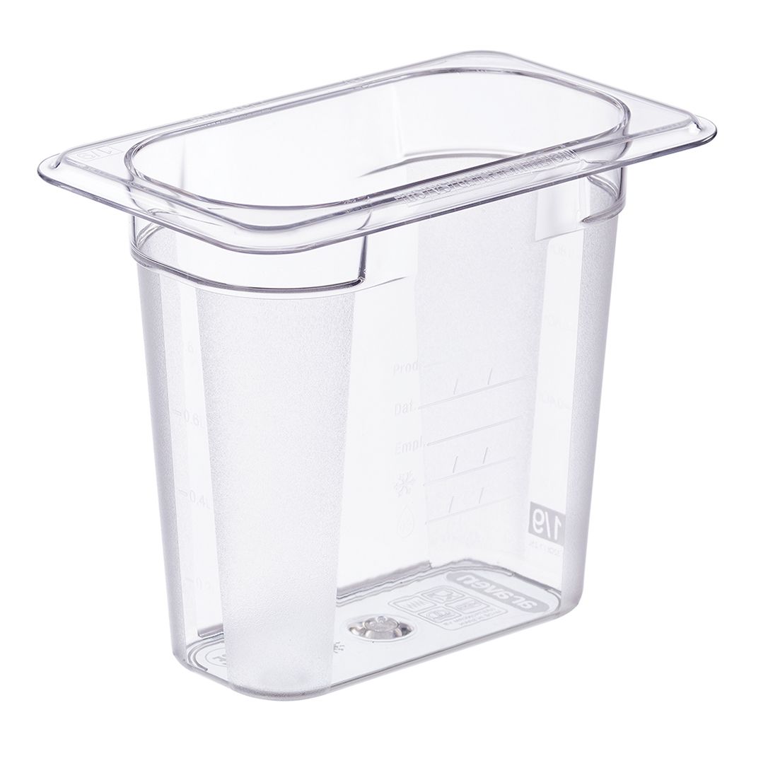 Гастроємність із полікарбонату GN 1/9 від бренду Araven рекомендовано використовувати для викладки та зберігання продуктів у холодильниках. Гастроємності з полікарбонату служать довше порівняно з іншими пластиковими гастроємностями. Матеріал виробу безпечний для контакту з продуктами харчування. Ємність підлягає переробці, завдяки екологічності матеріалу.