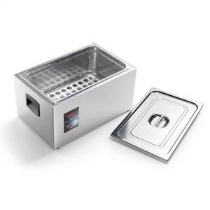 Су-Від апарат для низькотемпературного приготування з точним контролем температури та часу. Має потужні ударостійкі нагрівальні елементи з покриттям, що контактують з дном резервуара, а також корпус із нержавіючої сталі з IPX3. Су-від оснащений новою електронною панеллю керування з 25 програмами, , кнопками "Menu" та "Display". Забезпечує високу якість приготування та збереження смакових властивостей продуктів.