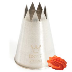 Кондитерська насадка BS 117 від італійського бренду Martellato рекомендується використовувати для роботи з кремами і кондитерськими мішками, ідеально підходить для відсадки рельєфних шапочок на капкейках, формування акуратних розеток та завитків, а також для створення виразних бордюрів та декоративних хвиль на тортах та десертах
