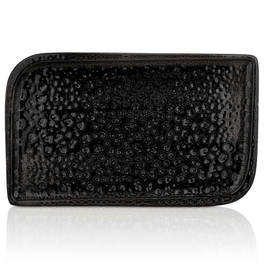 Блюдо прямокутне CW-BL-AR-28-DT серії Cowry Black від турецького бренду By Bone рекомендовано використовувати для подачі м’ясних і рибних страв, вишуканих закусок, суші, сирних і м’ясних нарізок, а також десертів