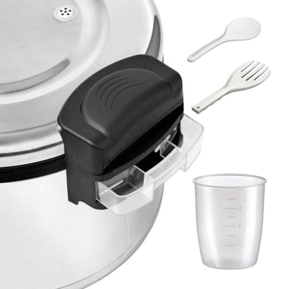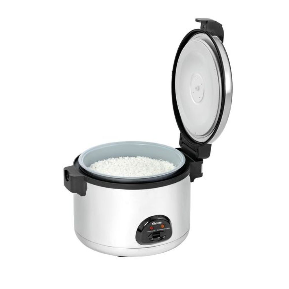 Об’єм: 12 л. Місткість (готовий рис): 6-9 кг. Продуктивність: 40-60 порцій (на 40-60 персон). У комплекті силіконовий килимок, мірний стаканчик, ложка для рису, ложка для перемішування. Матеріал чаші: алюміній з антипригарним покриттям. Матеріал корпусу: нержавіюча сталь. Габарити (ШхГхВ): 560х465х400 мм. Потужність: 2,85 кВт. Напруга: 220 В. Вага: 15,7 кг.