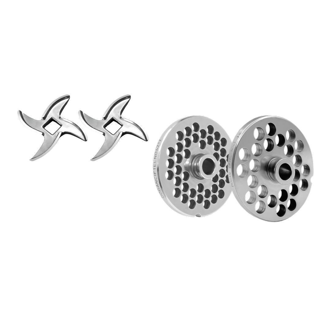 Комплектація: 2 ножа, 2 решітки, 3 насадки для ковбас (Ø 12 мм, 17 мм, 19 мм).