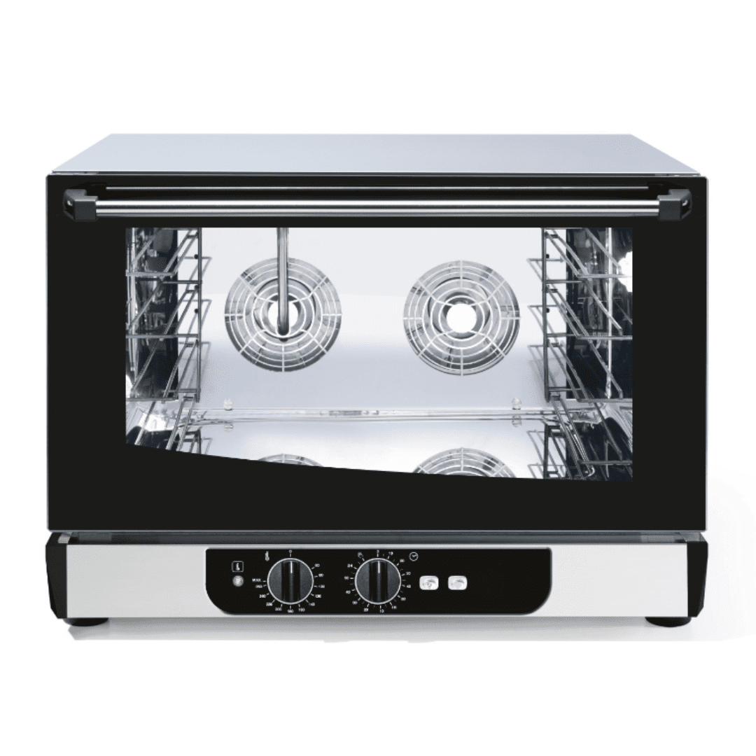Конвекційна піч з інжекторним парозволоженням, оснащена турбінним вентилятором з реверсом та направляючими під гастроємності GN1/1 + 600х400 мм та 2 дека.