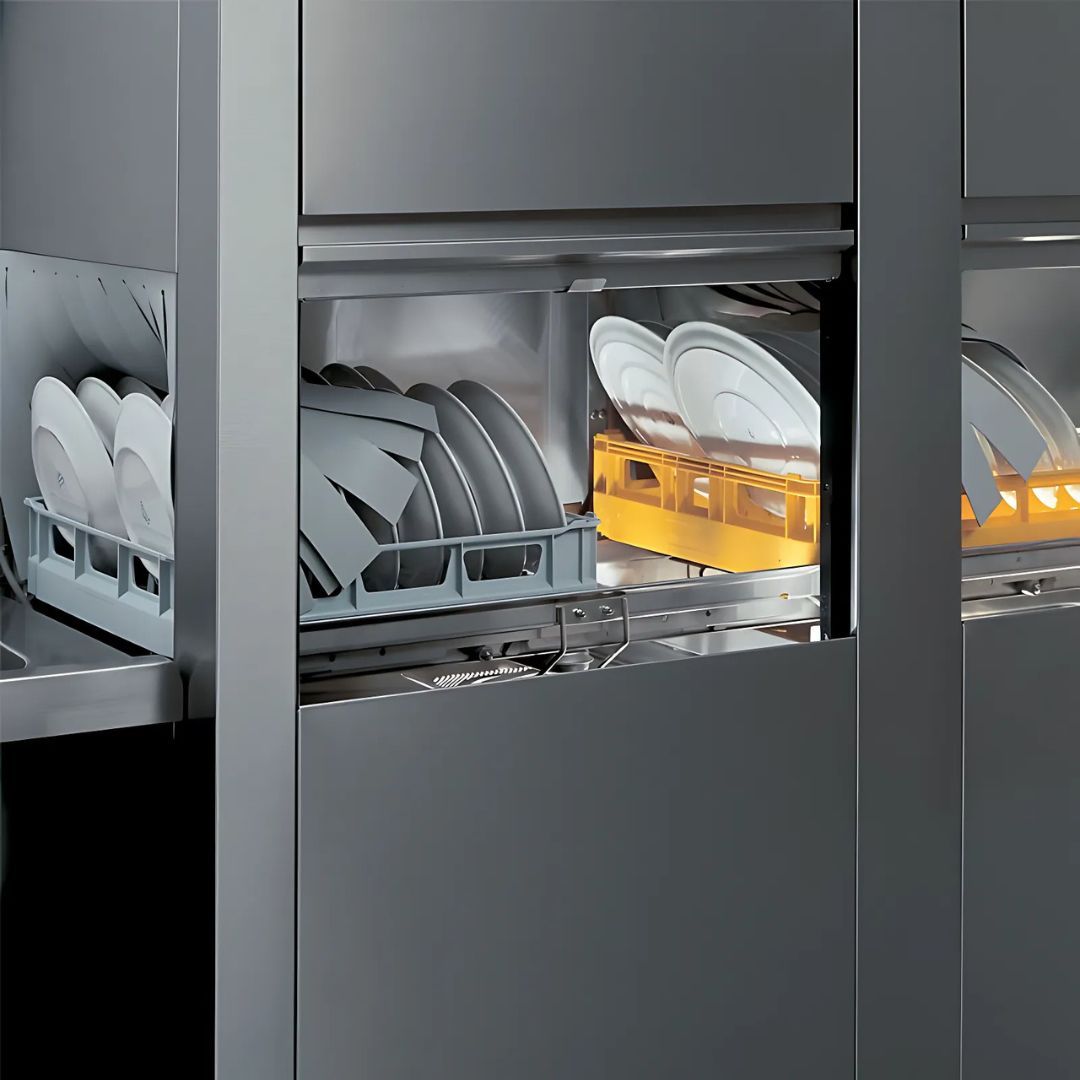 Тип: конвеєрна посудомийна машина. Панель керування: електронна. Продуктивність: до 200 касет/год. (3600 тарілок/год.). Розмір касети: 500х500 мм. Максимальна висота завантаження: 450 мм. Об’єм танкера: 70 л. Об’єм бойлера: 17 л. Витрати води за 1 цикл: залежить від режиму роботи. Дозатор для миючого і ополіскуючого засобів(додатково). Габарити (ШхГхВ): 1970х770х1615 мм. Потужність: 30,2 кВт (гаряча вода), 42,2 кВт (холодна вода). Напруга: 380 В. Вага: 335 кг.