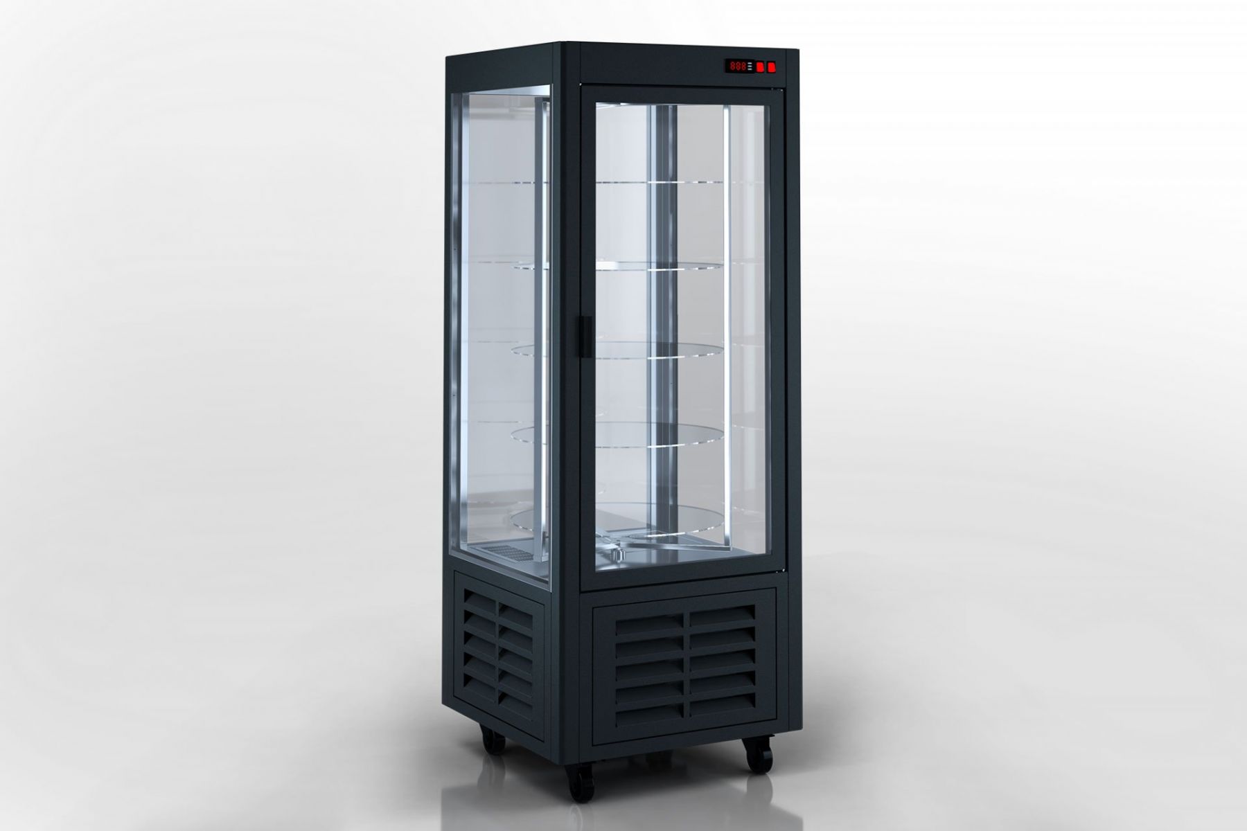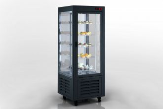 П’ять обертових скляних полиць створюють безперервну експозицію 360°, дозволяючи вигідно презентувати кожен десерт і привертати увагу клієнтів з будь-якого ракурсу. Скло, світло і рух формують вітрину, повз яку неможливо пройти.