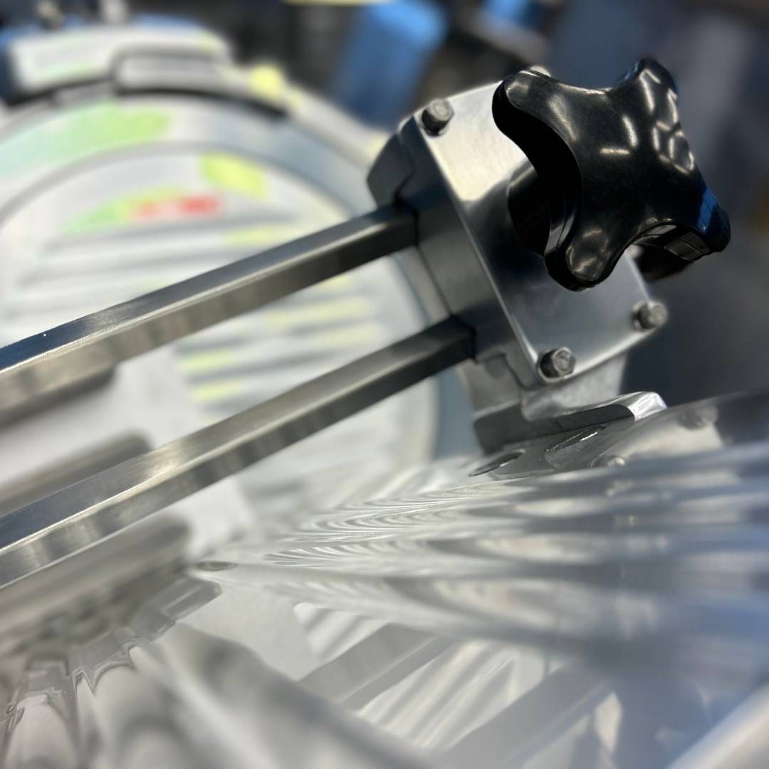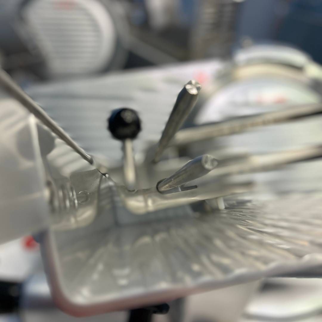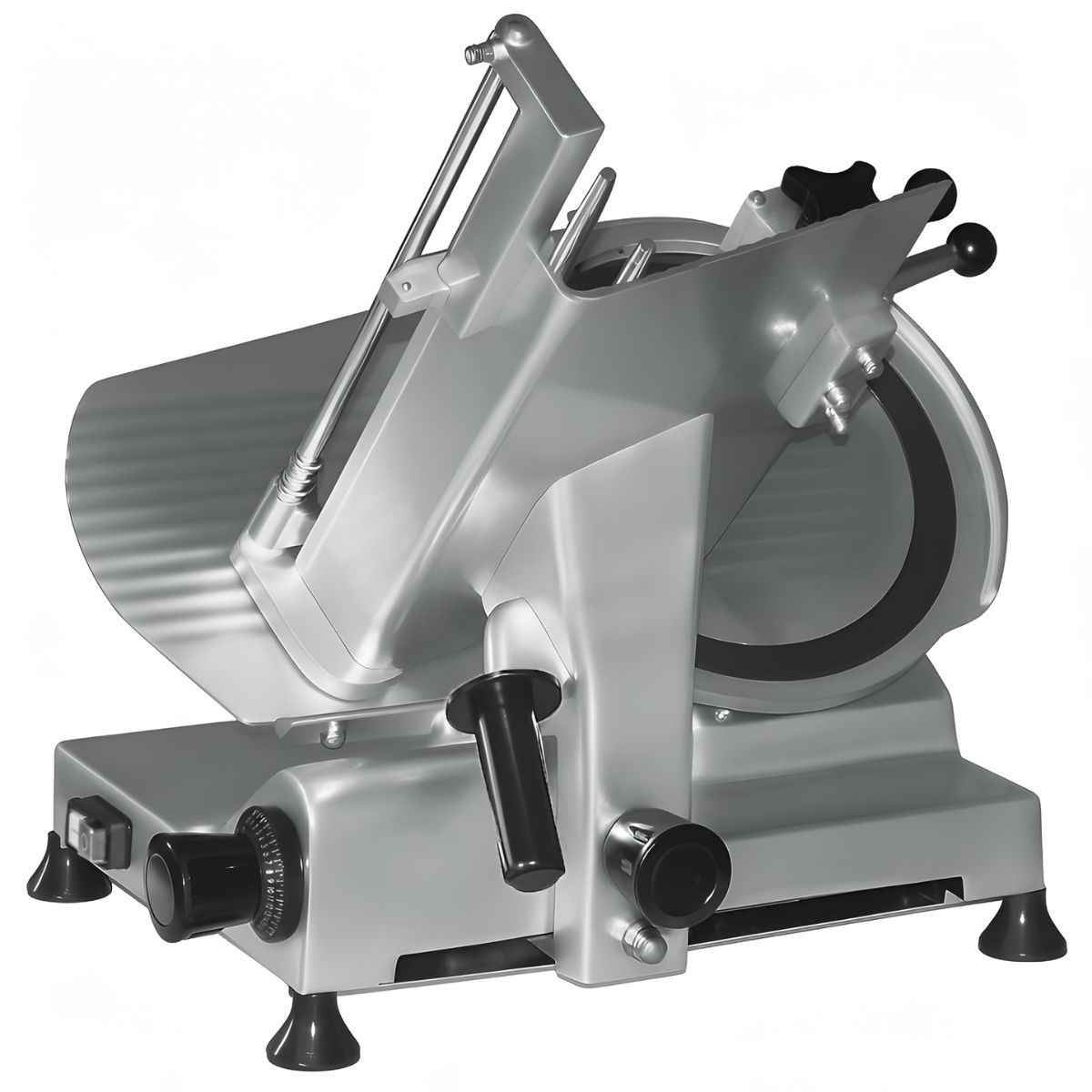 Слайсер оснащений лезом діаметром 300 мм, корпусом з алюмінію та вбудованим заточувальним пристроєм. Забезпечує товщину нарізки від 0,2 до 15 мм.